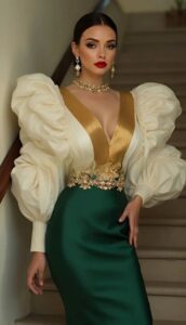 Fabric could be silk, crepe, sequins, high quality stretch or a structured satin that looks expensive and feels amazing. Sleeves, necklines, shawls and fancy coats are details you may also want to pay attention to. You can pair with stilettos, some statement earrings, and a nice clutch. Spots like the Armani Hotel restaurants close to the Burj Khalifa will be a perfect match with this fit.